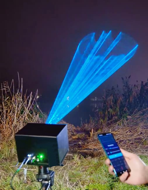 Наш лазерный проектор применяется для рекламы на холмах и горах - шикарный проектор с простым управлением, оборудование способно работать как в автоматическом режиме, так и проигрывать несколько анимаций по плейлисту.